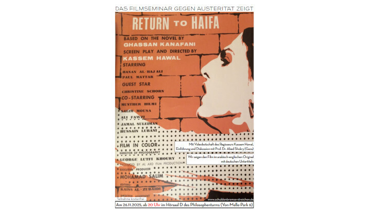 Die nächste Veranstaltung findet am Mittwoch, den 26. November 2025, ab 20 Uhr (ct) statt. Im Kokoschka-Hörsaal (Phil D) im Philosophenturm (Von-Melle-Park 6) schauen und diskutieren wir zusammen den Film „Rückkehr nach Haifa“ von Kassem Hawal aus dem Jahr 1982.